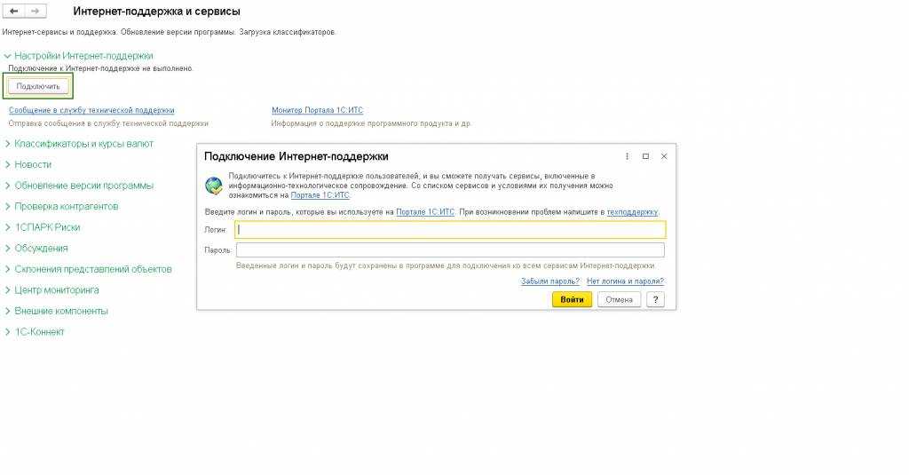 — В меню «Администрирование» — «Интернет-поддержка пользователей» должна быть подключена интернет-поддержка.