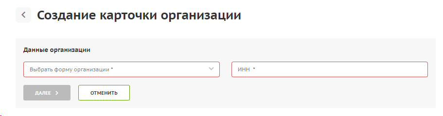 Откроется окно создания карточки организации. Введите ИНН и форму организации и нажмите на кнопку «Далее».