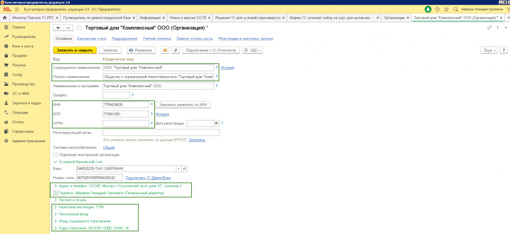 - Заполнить свойства организации или предпринимателя, подключаемых к «1С-Отчетности» (ИНН, наименование организации и ОКПО для организаций, и т.п.).