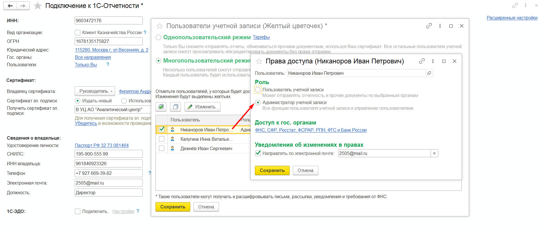 Есть возможность назначить роли для пользователей сервиса, например, роль «Администратор». Администратор многопользовательского режима устанавливает для пользователей такие права, как: