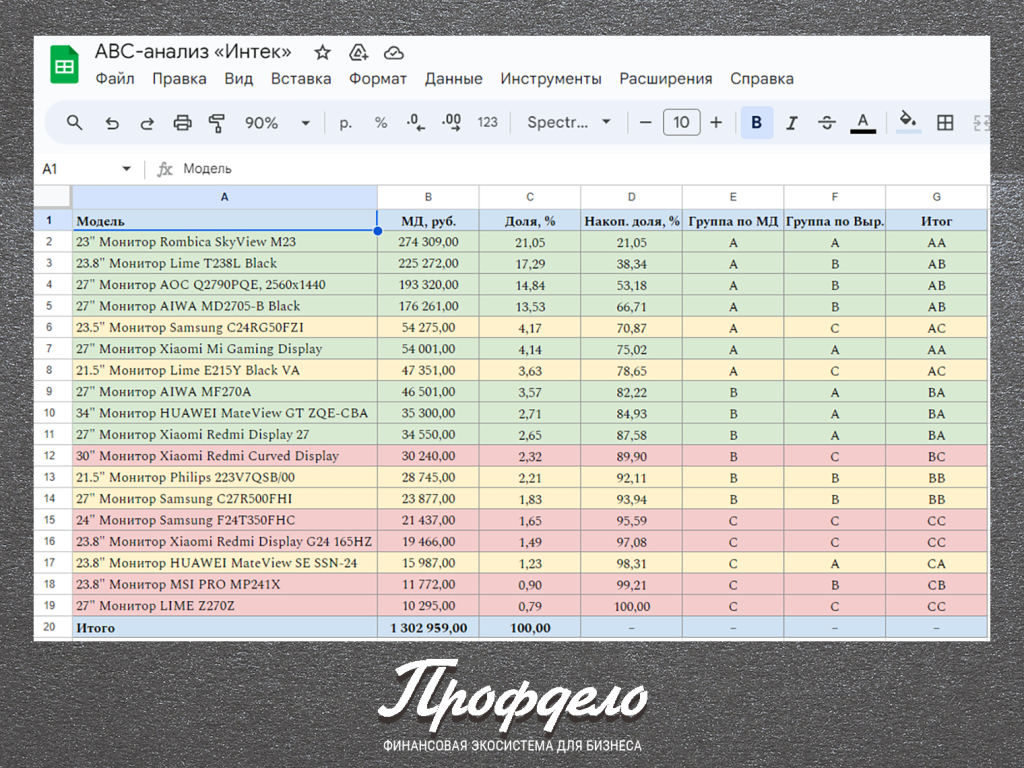 - Все оставшиеся позиции/строки от накопительного показателя 95 % до конца списка — группа C.