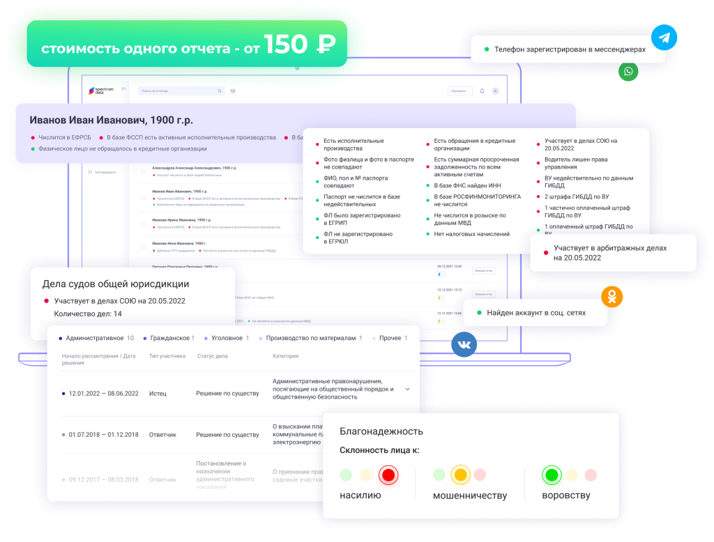 Сформировав запрос на SpectrumData, спустя 3-5 минут вы получите полный отчет о деталях жизни соискателя или действующего сотрудника. Такая оценка может стать альтернативой проверке службы безопасности или помочь оптимизировать работу СБ – специалисты смогут уделить больше времени уточнению отдельных фактов.