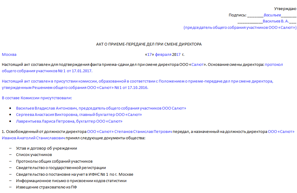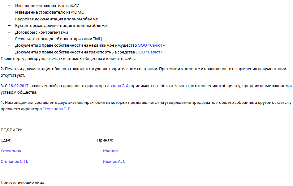 - В описательной части перечисляются Ф.И.О. участвующих лиц в передаче документов, с отображением должностей.