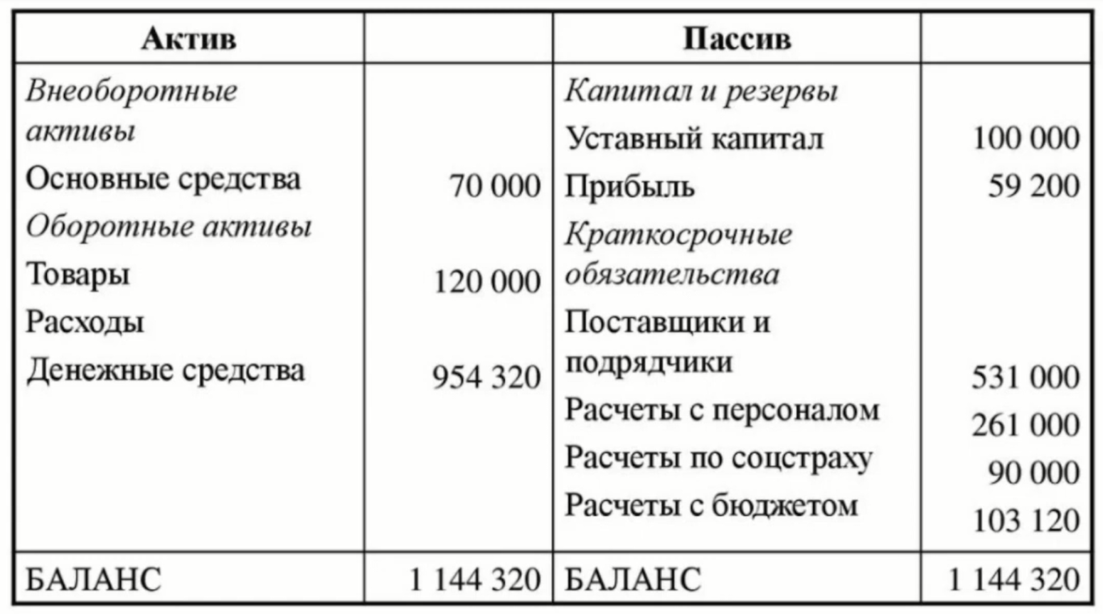 Пассивы баланса: кредиты – 400 000 руб., текущие расходы – 700 000 руб.