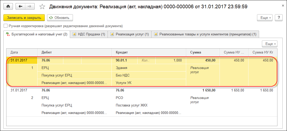 Дт 76 (ЕРЦ) / Кт 90 (УК) – Начислены услуги УК