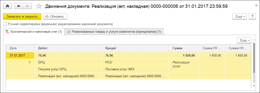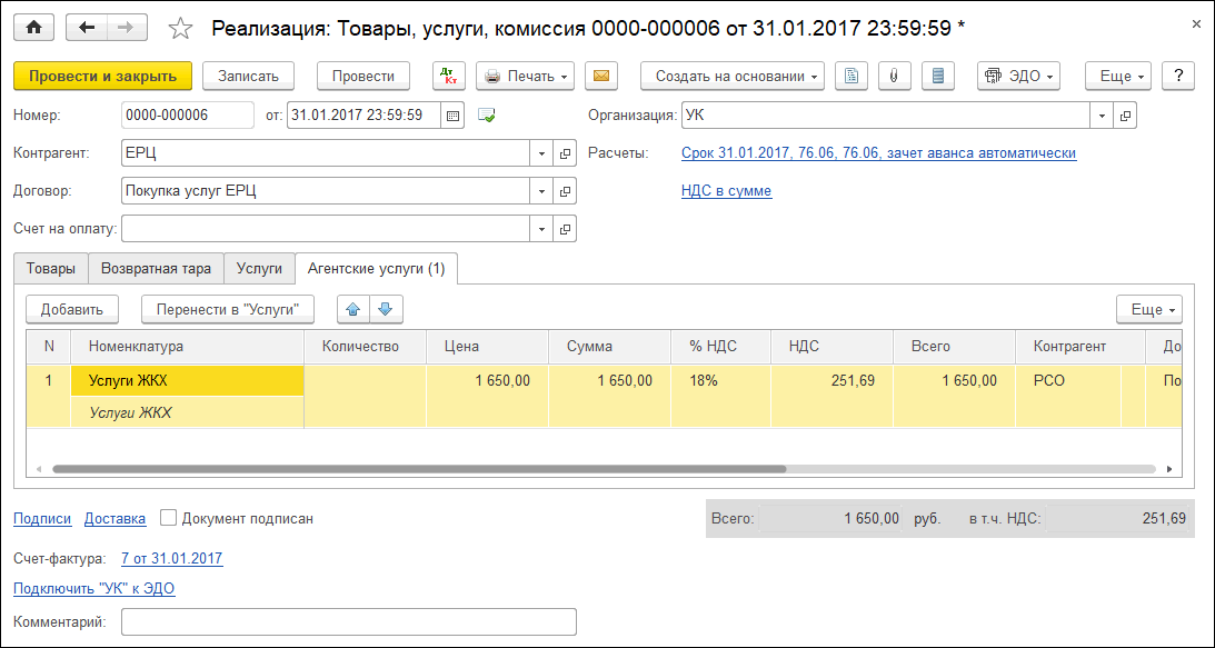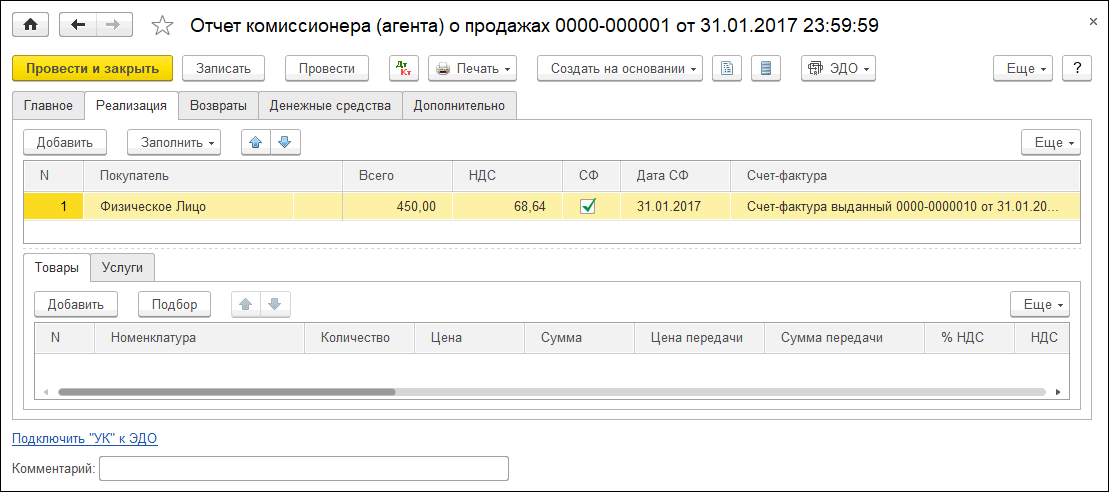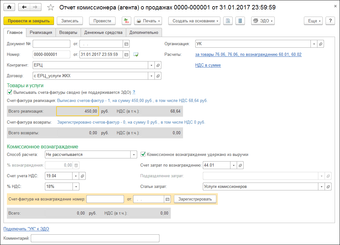 Оформим документ «Отчет комитенту». На вкладке «Главное» укажем контрагента — РСО, договор, на вкладке «Товары и услуги» — оказываемые услуги, сумму, НДС и покупателя — ЕРЦ, дату реализации: