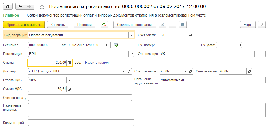 Создаем документ «Поступление на расчетный счет» с видом операции «Оплата от покупателя» от ЕРЦ: