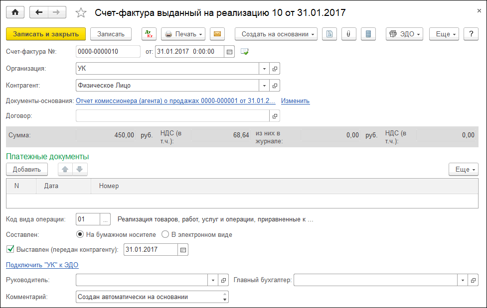 После проведения документа «Отчет комитенту» сформируется «Счет-фактура выданный», где будет указан покупатель – жилец: