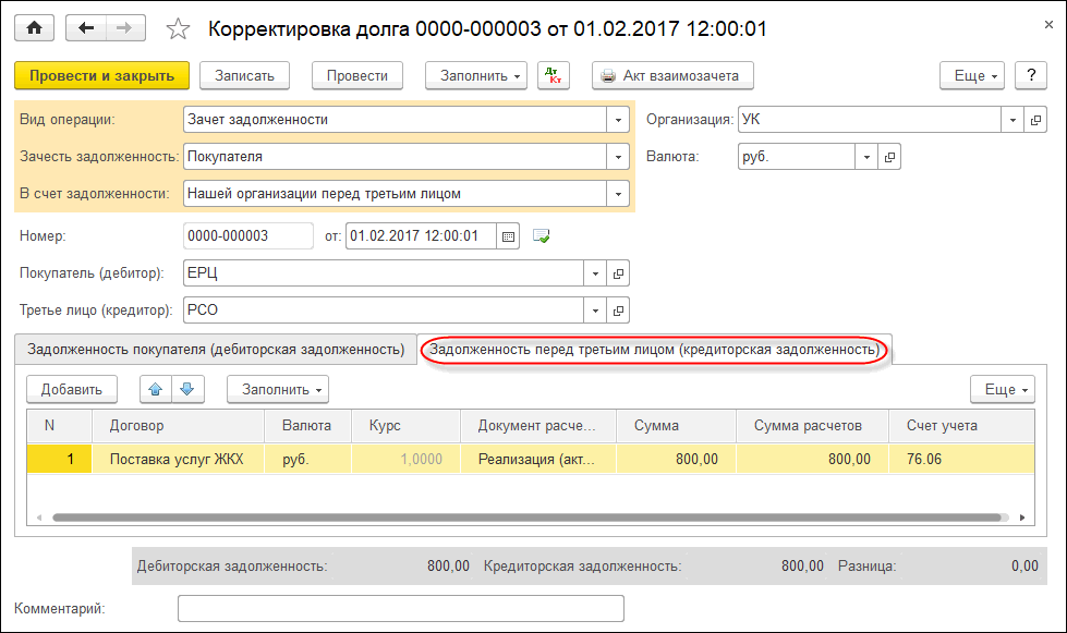 Оформляется при помощи документа «Корректировка долга» с видом операции «Зачет задолженности», то есть необходимо зачесть задолженность поставщику в счет задолженности третьего лица перед нашей организацией (УК). Создаем документ «Корректировка долга» в разделе «Продажи»: