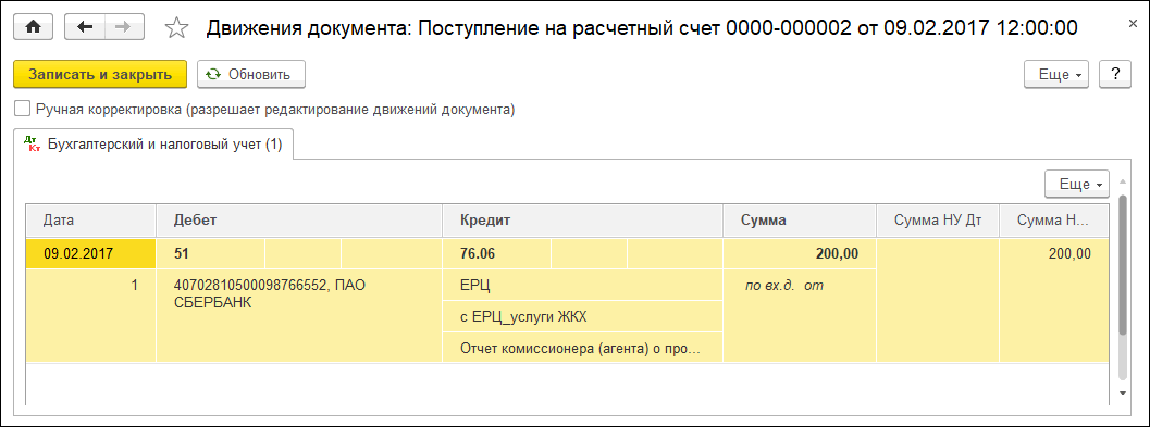 Дт 51 / Кт 76 (ЕРЦ) – Поступление оплаты от ЕРЦ за услуги наши услуги (услуги УК)