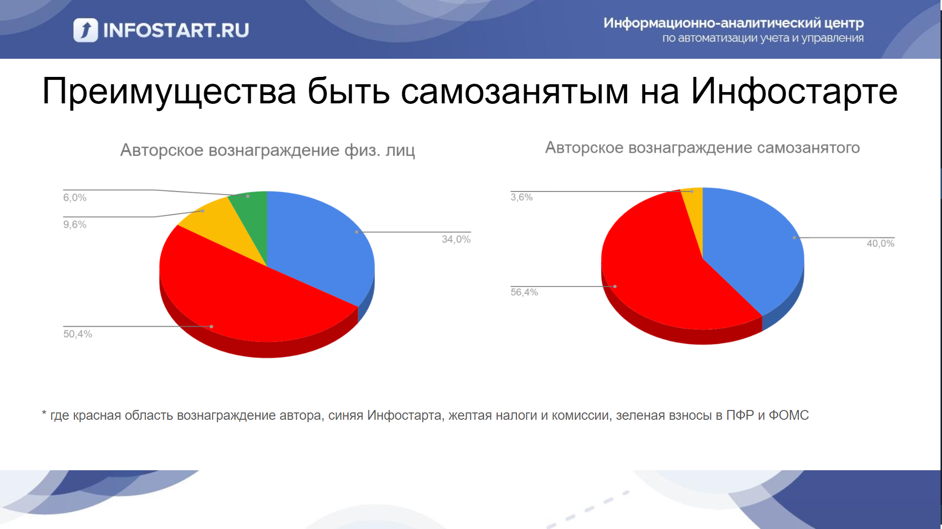 Почему выгодно становиться самозанятым? При стандартном стиле вознаграждения 60/40 у самозанятого мы не будем удерживать никаких комиссий. Т.е. в сумму выплаты пойдет все 60%.