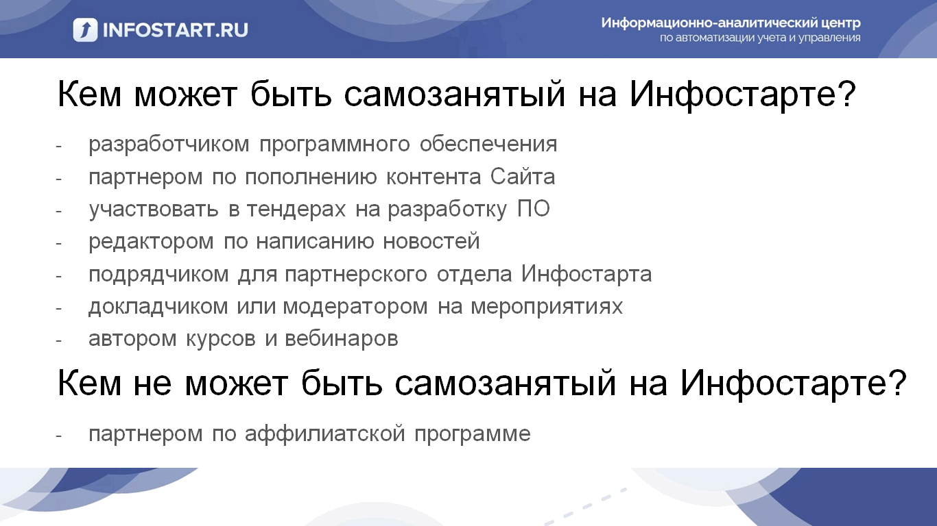 При дистанционном взаимодействии с партнером можно применять данный налоговый режим по месту нахождения своего партнера. То есть если вы живете в регионе, где такой налоговый режим не введен, сотрудничать с Инфостартом в качестве самозанятого вы можете, поскольку в Санкт-Петербурге режим налога на профессиональный доход действует.