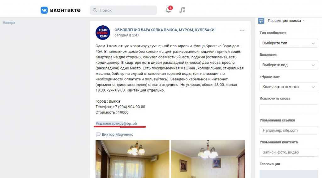 Альтернативный вариант — социальные сети. Группы поиска жилья в нужном регионе в ВК постоянно пополняются свежими сообщениями от собственников (впрочем, и здесь не избежать встреч с риелторами). Еще один способ поиска: вбить в поисковой строке тематический хештег (например, #сдамквартирумск или #сдаю_комнату_питер и т.д.). Выбрав подходящее объявление можно зайти на страничку его владельца, посмотреть, реальная она или фейковая, и, если страничка не вызовет подозрений, написать сообщение и уточнить детали.