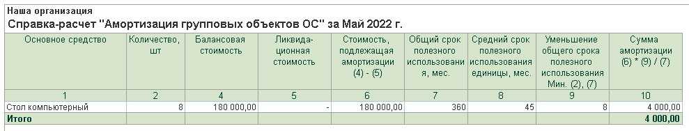 Начисленная амортизация в мае составляет 4 000 руб. (180 000 руб. х 8 мес. / 360 мес.). Именно эта сумма отражена в Справке-расчете амортизации групповых объектов ОС за май (рис. 6).