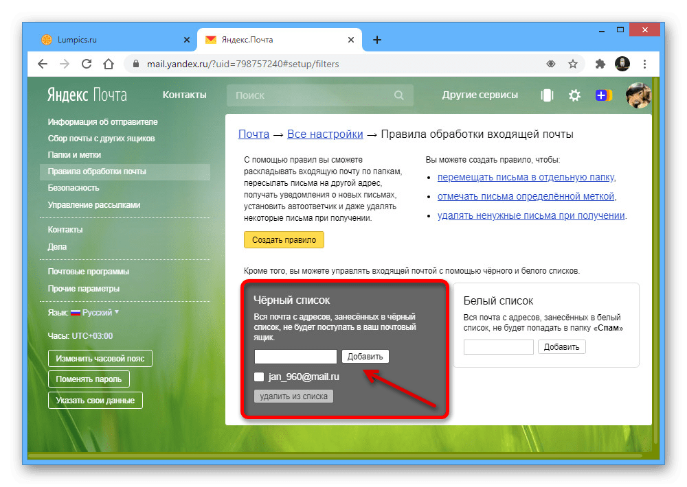 Почта от Яндекс, вне зависимости от версии, предоставляет не только систему автоматической сортировки писем по конкретным папкам с помощью фильтров, но и специальный раздел «Черный список», призванный блокировать любую входящую информацию, тем самым, не требуя даже ручного удаления. Чтобы воспользоваться данной опцией, необходимо посетить страницу «Правила обработки писем» в «Настройках» и указать нужный адрес электронной почты в блоке «Черный список». Учтите, что после блокировки почта не будет поступать во входящие, из-за чего прочтение станет невозможным.