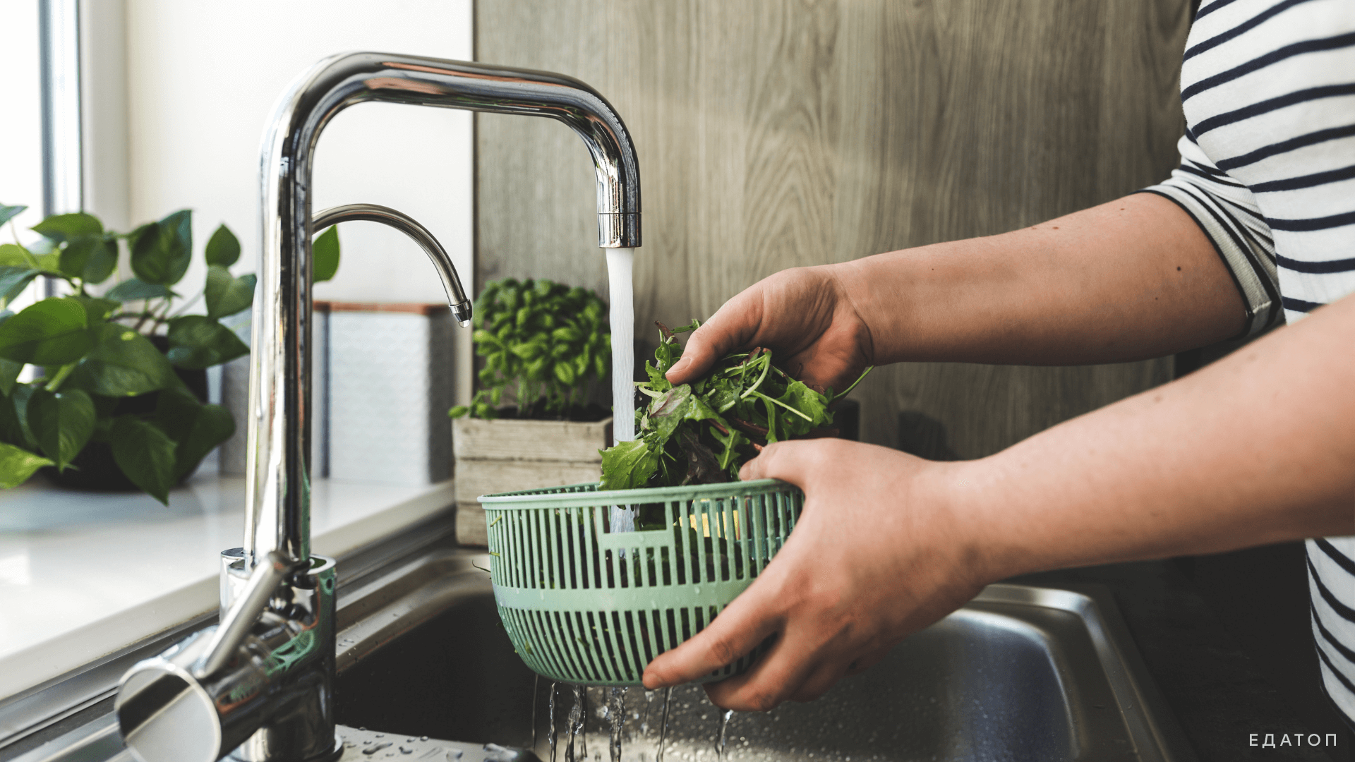 Повар второго разряда моет и очищает зелень.