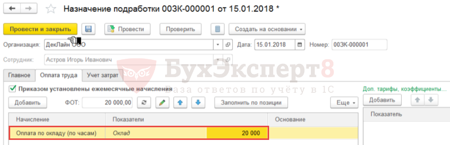 Создадим документ Назначение подработки (Кадры – Подработки – Назначение подработки). Указываем, что сотрудник Астров работает за сотрудника Каштанова. Автоматически загружается условия труда сотрудника Каштанова: график его работы и плановое начисление — Оплата по окладу в размере 20 000 руб.: