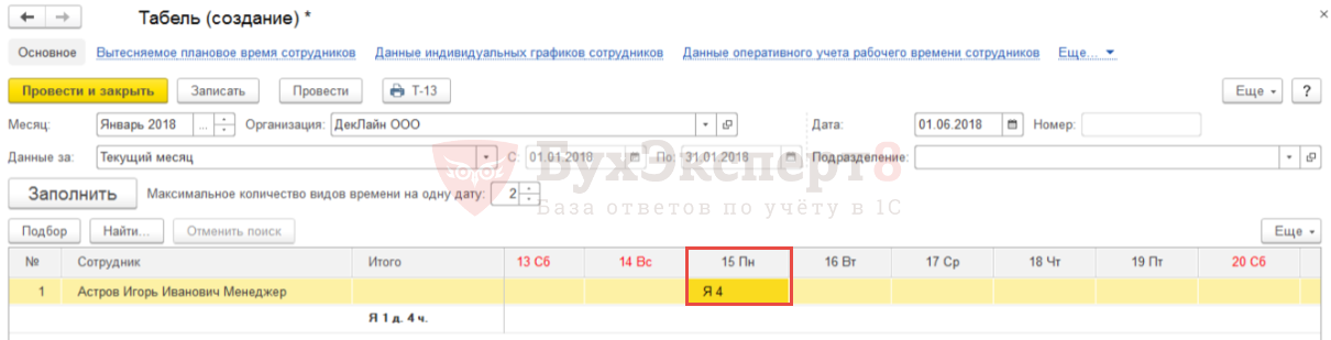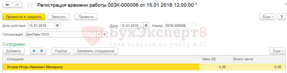 Добавим сотрудника в документ и укажем часы Явки – 4 часа: