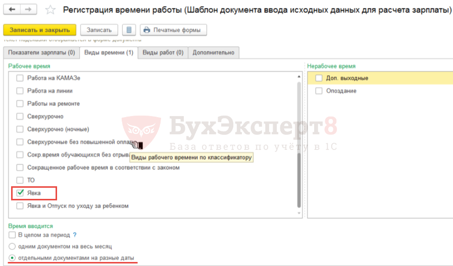 Другой вариант ввода количества отработанных часов – через документ в журнале Данные для расчета зарплаты. Для этого в Шаблоне ввода исходных данных необходимо создать новый элемент, назвав его, например, Регистрация времени работы. На вкладке Виды времени в таблице Рабочее время отметить флажком вид времени Явка и переключатель Время вводится установить в положение отдельными документами на разные даты: