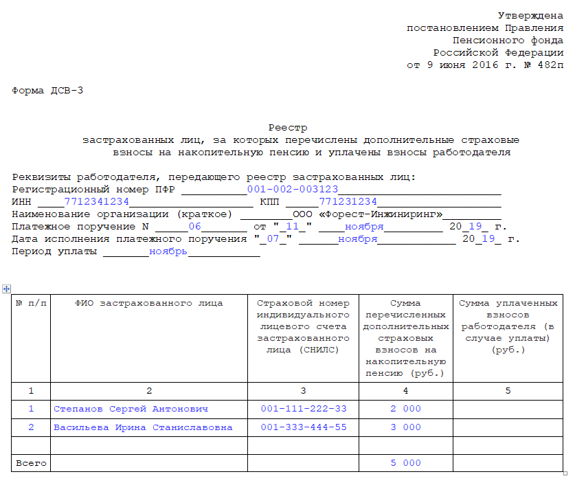По таким перечислениям компании и ИП отчитываются по форме ДСВ-3, которая утверждена Постановлением Правительства от 09.06.2016 г. № 482п. Бланк документа имеет название — «Реестр застрахованных лиц, на которых перечислены дополнительные взносы на накопительную пенсию и уплачены взносы работодателя».