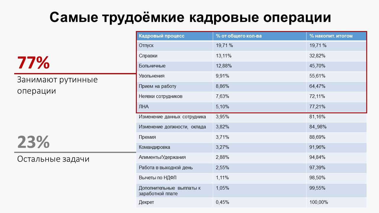 Мы провели исследование в нашей компании и выявили самые трудоемкие операции, которые возникают при взаимодействии с сотрудником по кадровым процессам. Такие операции возникали при оформлении отпусков, справок, больничных, увольнений, приема на работу, неявок сотрудника и ЛНА.