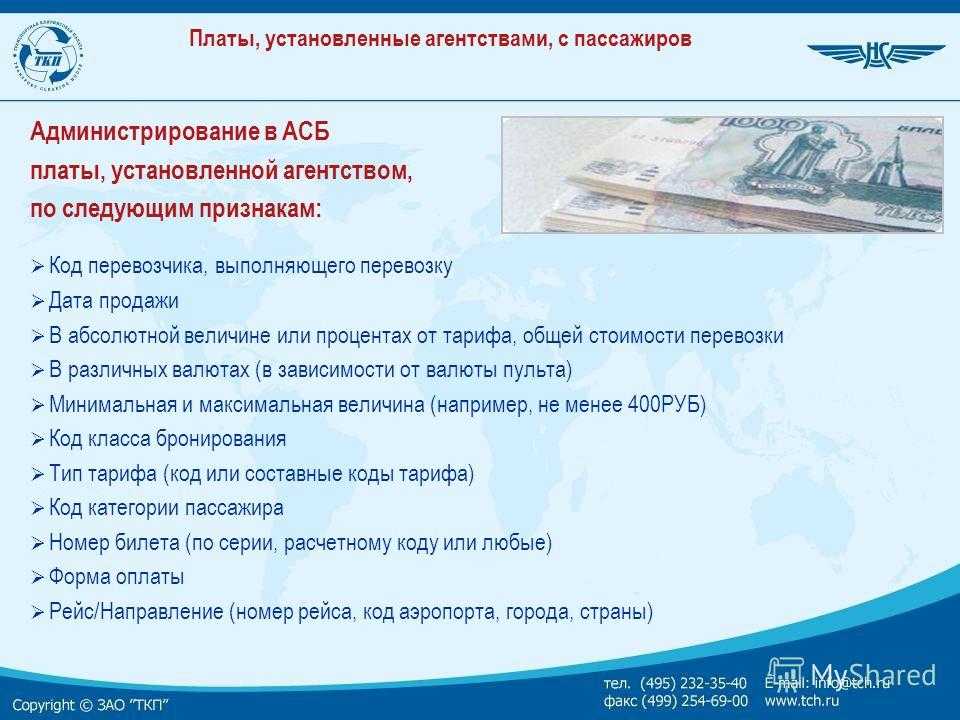 Код перевозчика, выполняющего перевозку Дата продажи В абсолютной величине или процентах от тарифа, общей стоимости перевозки В различных валютах (в зависимости от валюты пульта) Минимальная и максимальная величина (например, не менее 400РУБ) Код класса бронирования Тип тарифа (код или составные коды тарифа) Код категории пассажира Номер билета (по серии, расчетному коду или любые) Форма оплаты Рейс/Направление (номер рейса, код аэропорта, города, страны) Администрирование в АСБ платы, установленной агентством, по следующим признакам: