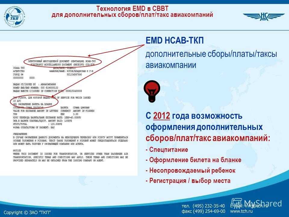 Технология EMD в СВВТ для дополнительных сборов/плат/такс авиакомпаний С 2012 года возможность оформления дополнительных сборов/плат/такс авиакомпаний: — Спецпитание — Оформление билета на бланке — Несопровождаемый ребенок — Регистрация / выбор места EMD НСАВ-ТКП дополнительные сборы/платы/таксы авиакомпании