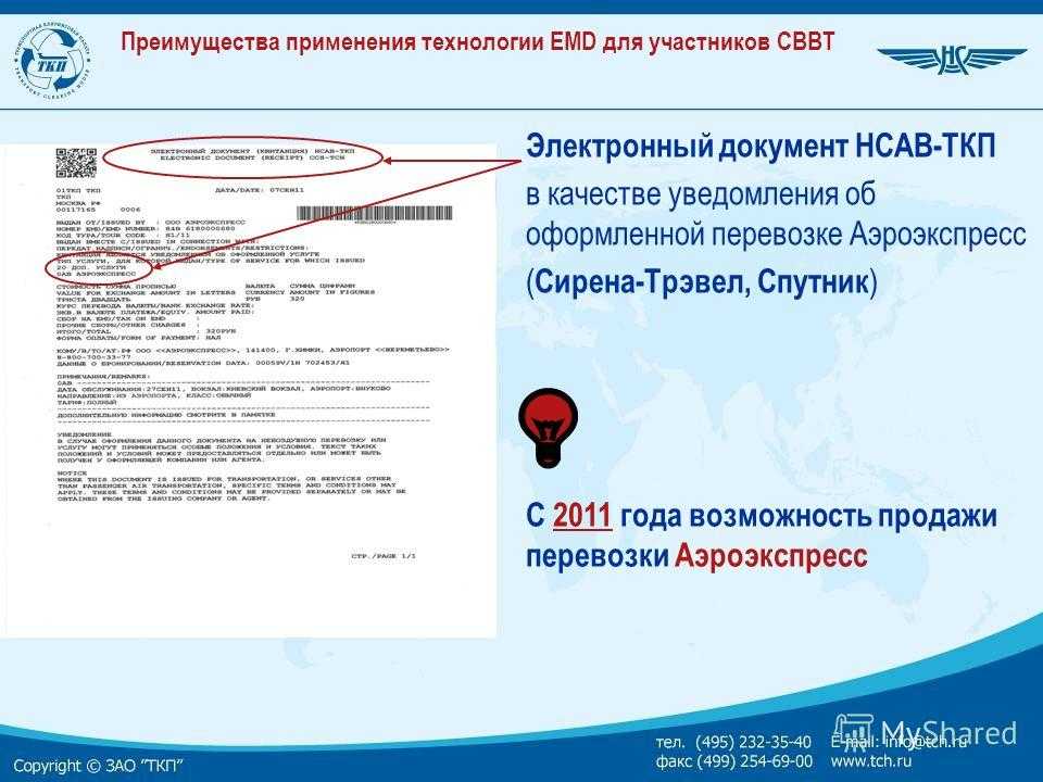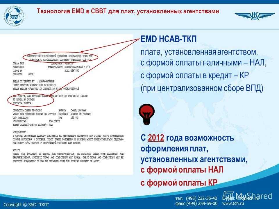 Преимущества применения технологии EMD для участников СВВТ С 2010 года реализован переход к 100% электронному документированию операций, связанных с воздушной перевозкой EMD НСАВ-ТКП сборы/платы авиакомпании при отказе от перевозки/изменении условий перевозки ( Сирена-Трэвел )
