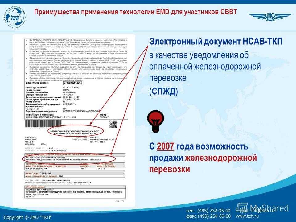 Преимущества применения технологии EMD для участников СВВТ С 2007 года возможность продажи железнодорожной перевозки Электронный документ НСАВ-ТКП в качестве уведомления об оплаченной железнодорожной перевозке ( СПЖД )