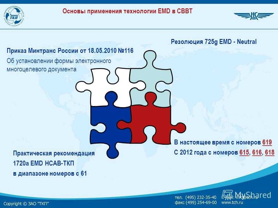 Основы применения технологии ЕМD в СВВТ Приказ Минтранс России от Об установлении формы электронного многоцелевого документа Резолюция 725g EMD — Neutral Практическая рекомендация 1720а ЕМD НСАВ-ТКП в диапазоне номеров с 61 В настоящее время с номеров 619 С 2012 года с номеров 615, 616, 618