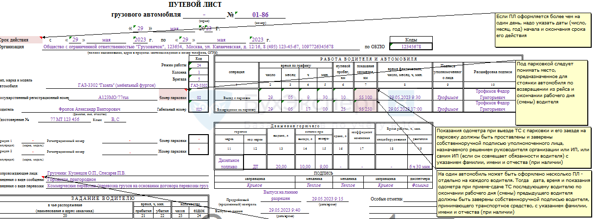 Путевой лист грузового автомобиля — пример заполнения после 01.03.2023