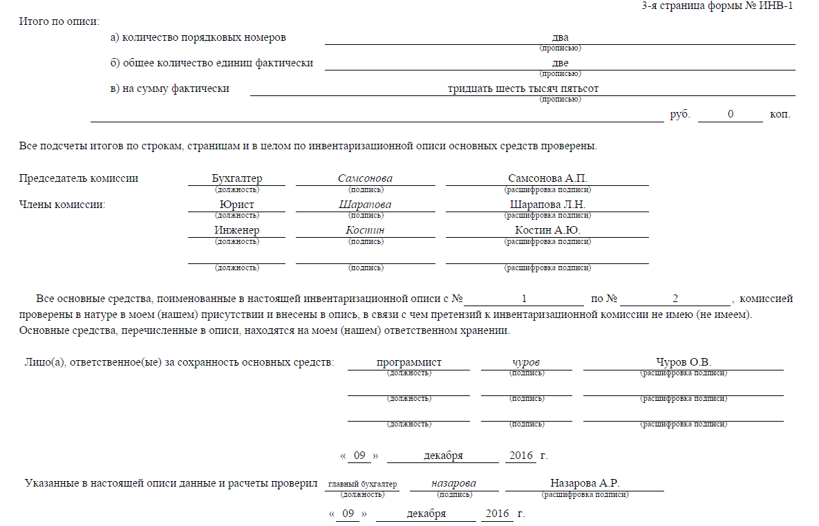 На 3-й странице инвентаризационная опись основных средств подписывается всеми членами комиссии и сотрудником, ответственным за их сохранность
