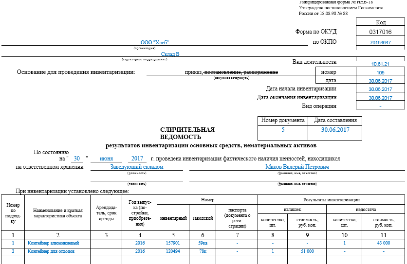 Образец заполнения сличительной ведомости по форме ИНВ-18 вы можете скачать на нашем сайте: