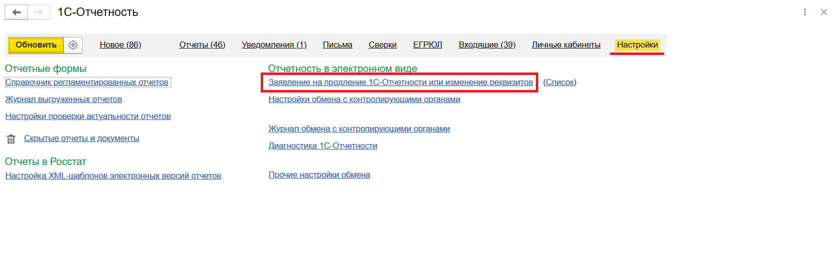гиперссылка Заявление на продление 1С-Отчетности или изменение реквизитов (рис.1).