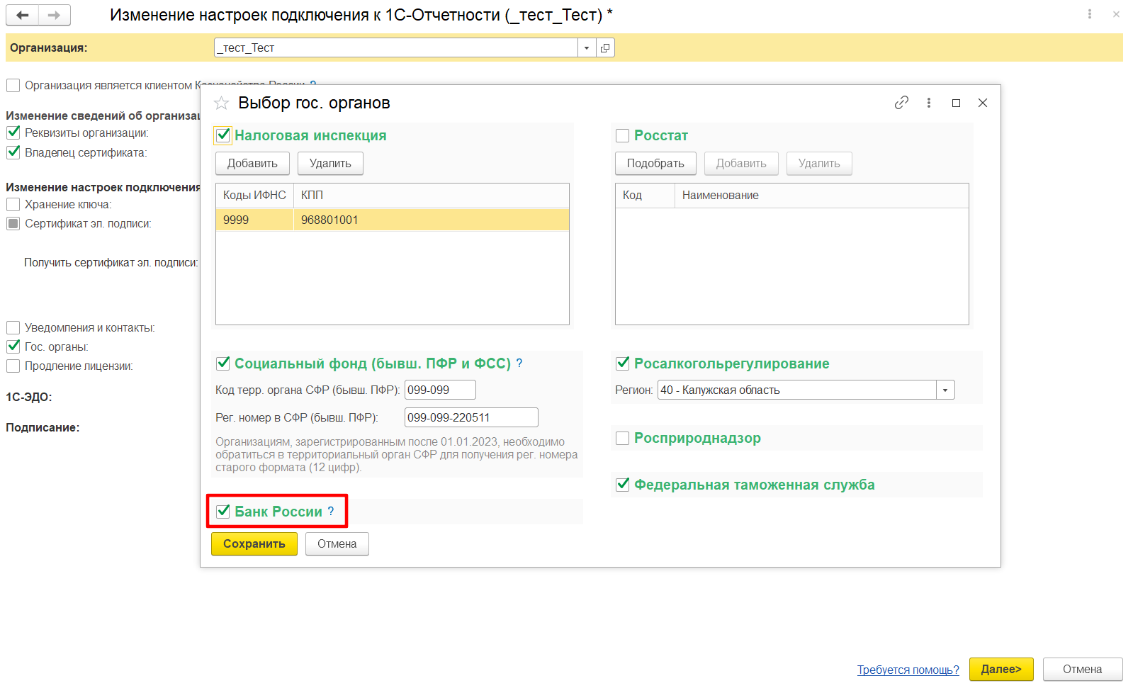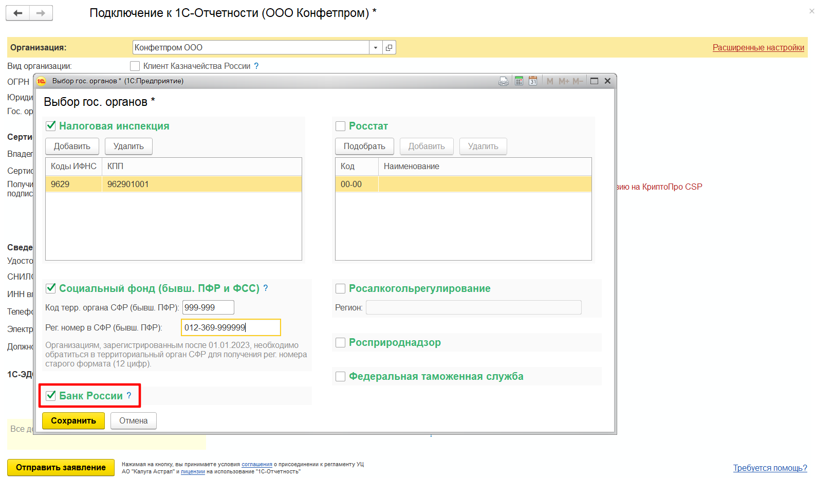 Для этого необходимо подключить направление «Банк России» в настройках 1С-Отчетности.