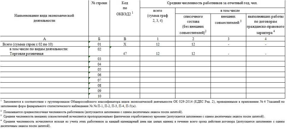 В разделе 1 следует указать среднесписочную численность работников организации в разбивке по отраслям деятельности. Учтите всех лиц, работающих на основании трудовых договоров, в том числе выполняющих временную или сезонную работу, и владельцев организации, если они получают зарплату. В среднесписочную численность традиционно не включаются внешние совместители, лица, с которыми заключены гражданско-правовые договоры, сотрудницы, находящиеся в отпусках по уходу за ребенком, и сотрудники в учебном отпуске. Информацию о внешних совместителях и работниках по ГПД указывают в отдельных колонках.