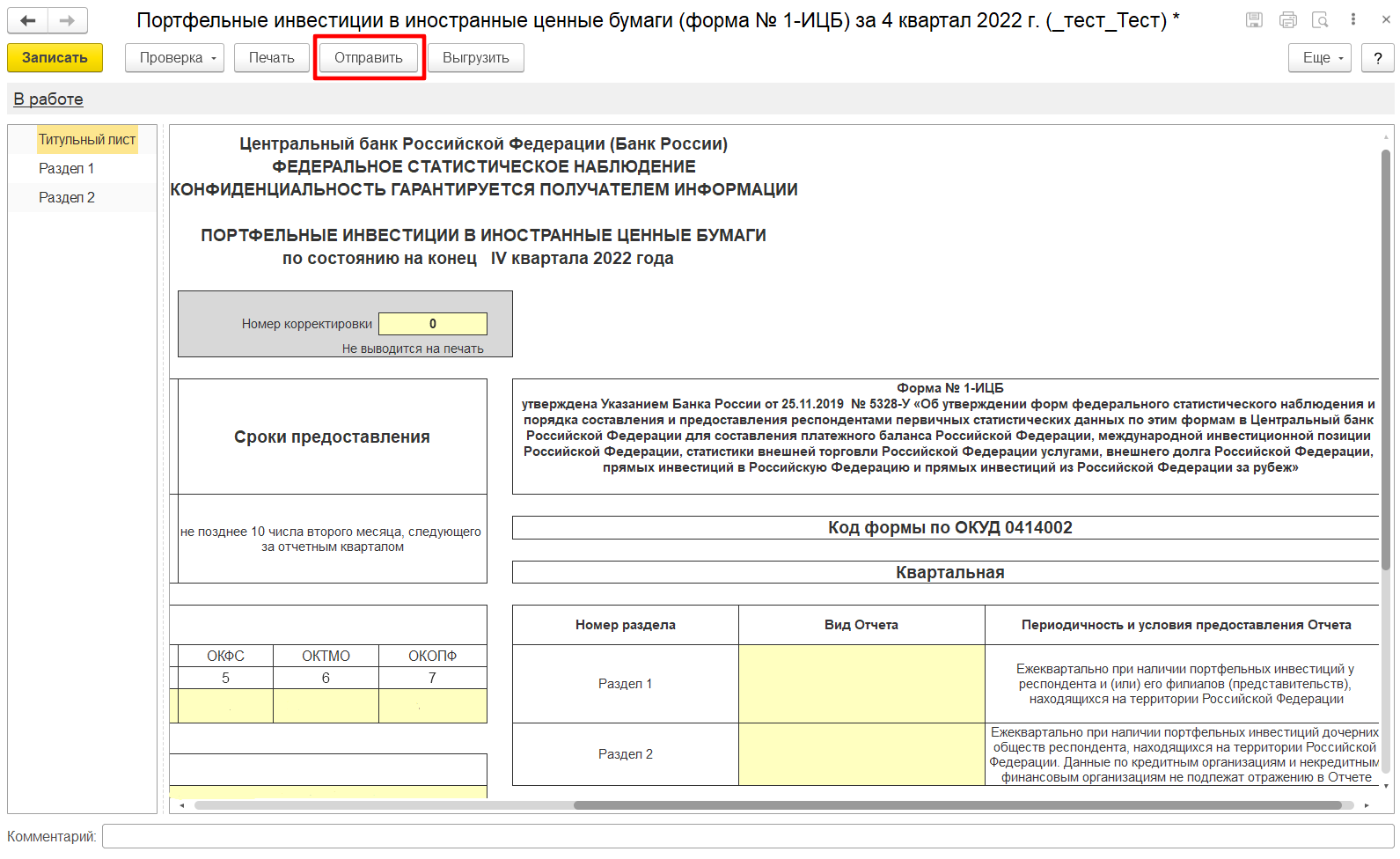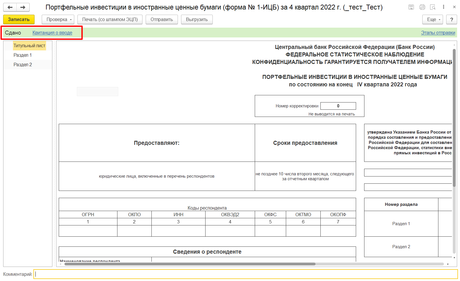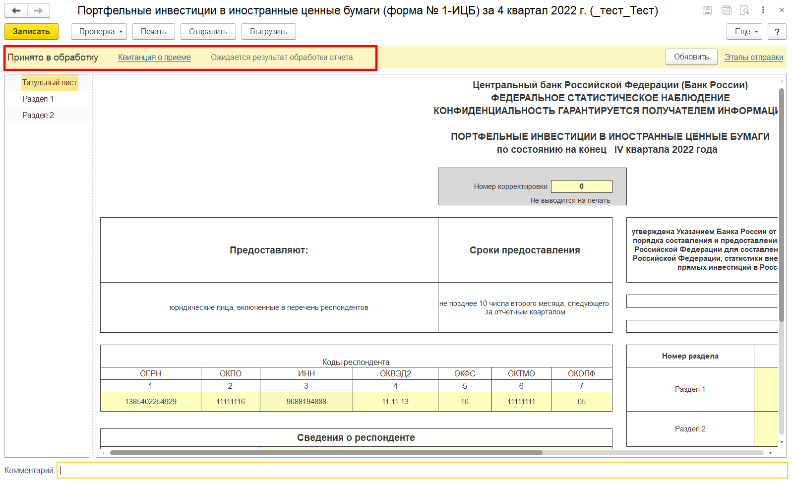 После отправки статус отчета примет значение Отправлено в Банк России.
