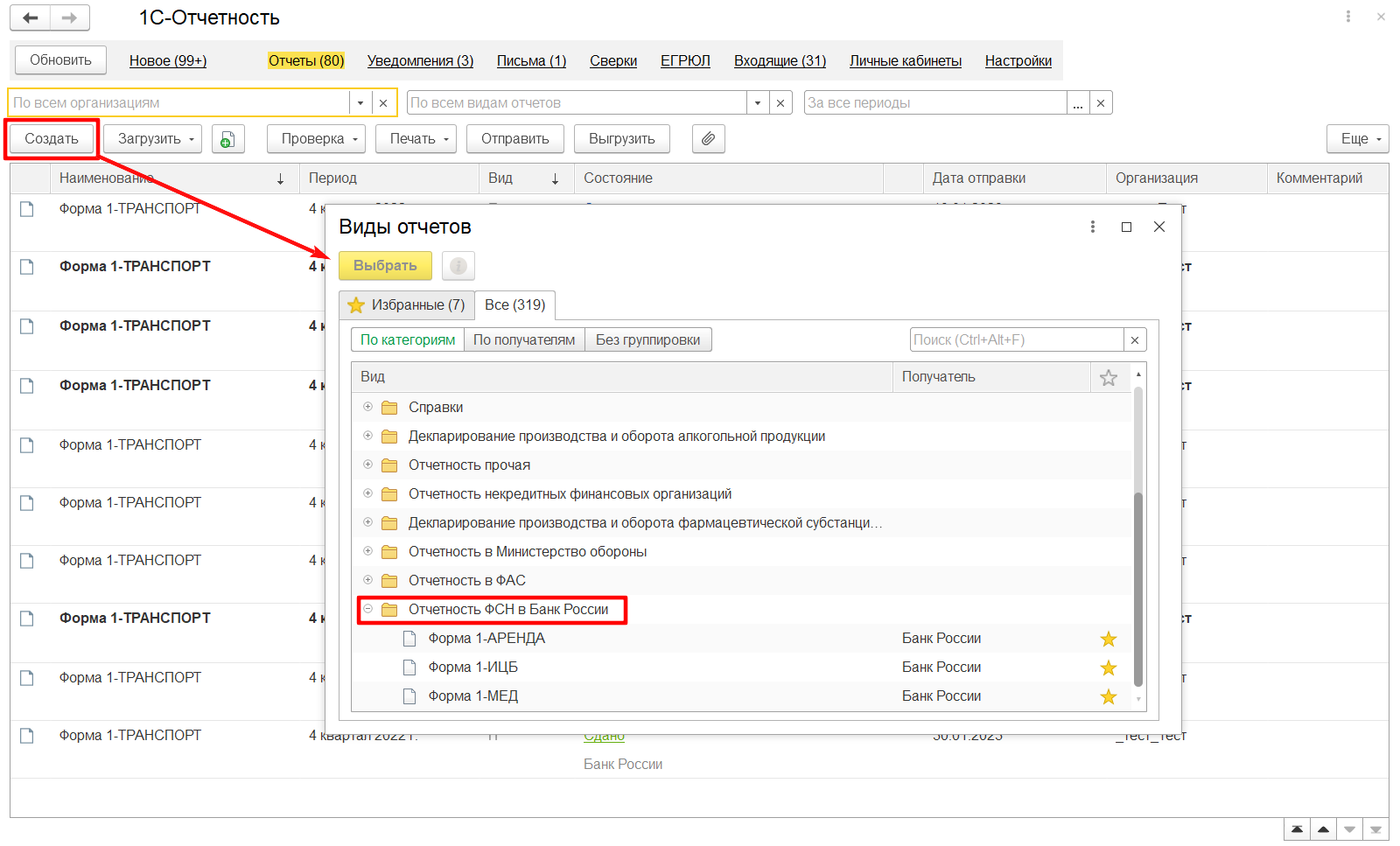 1С-Отчетность перейдите на закладку Отчеты, нажмите кнопку Создать.