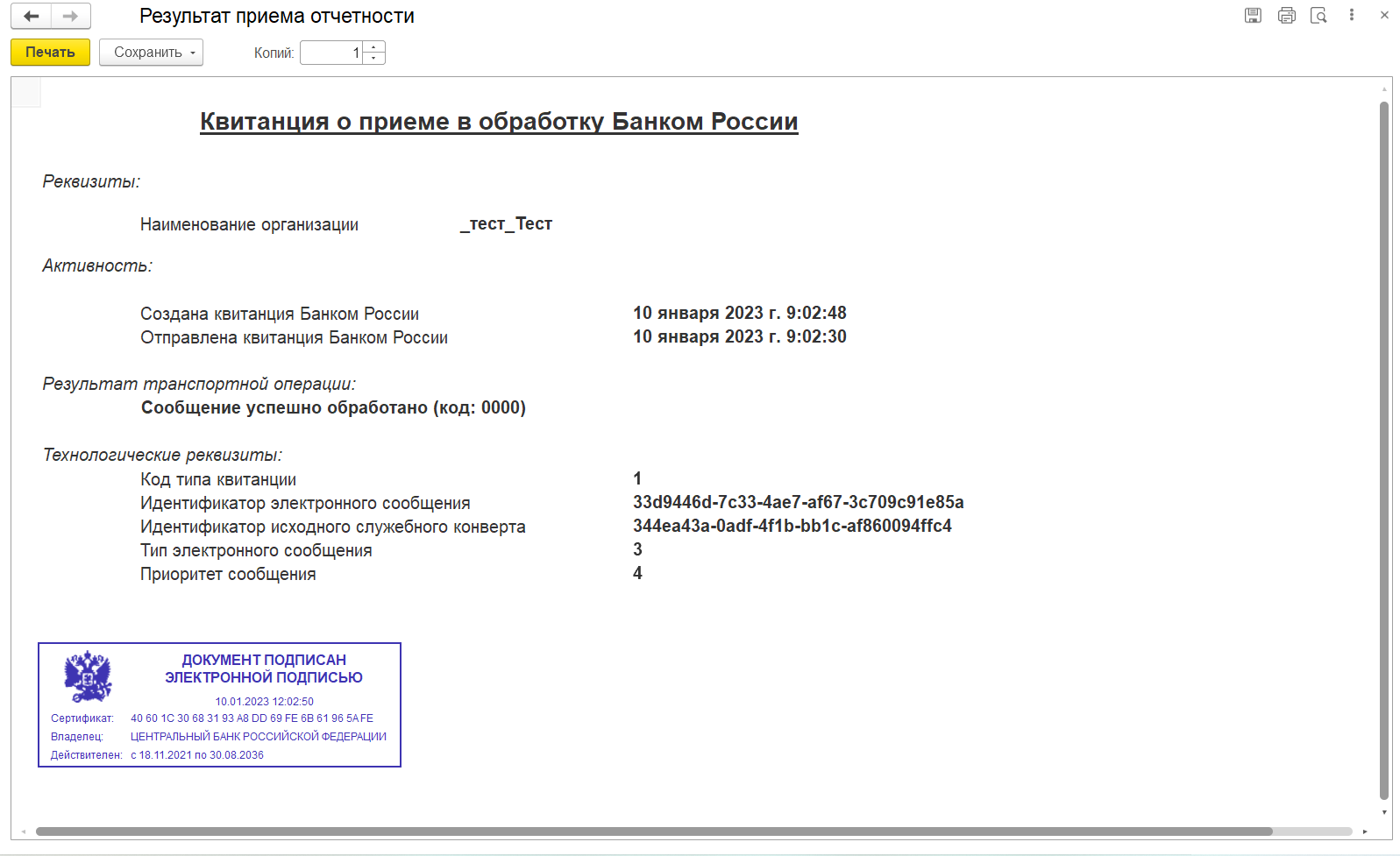 В течение нескольких секунд после отправки Банк России направит квитанцию о приеме в обработку (рис. 7).