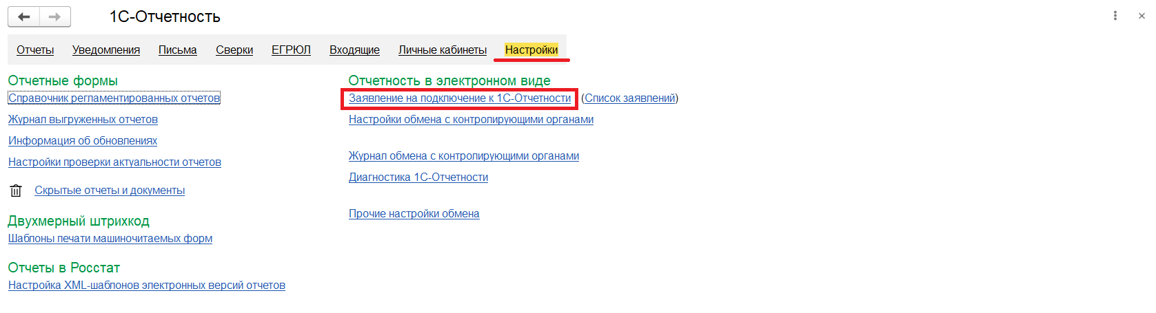 процесс подключения к 1С-Отчетности. Подробнее об этом см. в статье