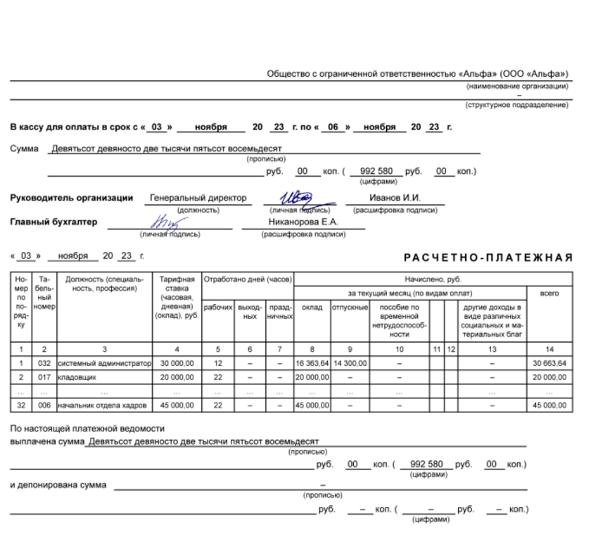 Итоговые данные платежной и расчетной форм должны совпадать. Исключением станут только суммы депонированной зарплаты, которую работники не смогли получить в день выдачи по уважительным причинам.