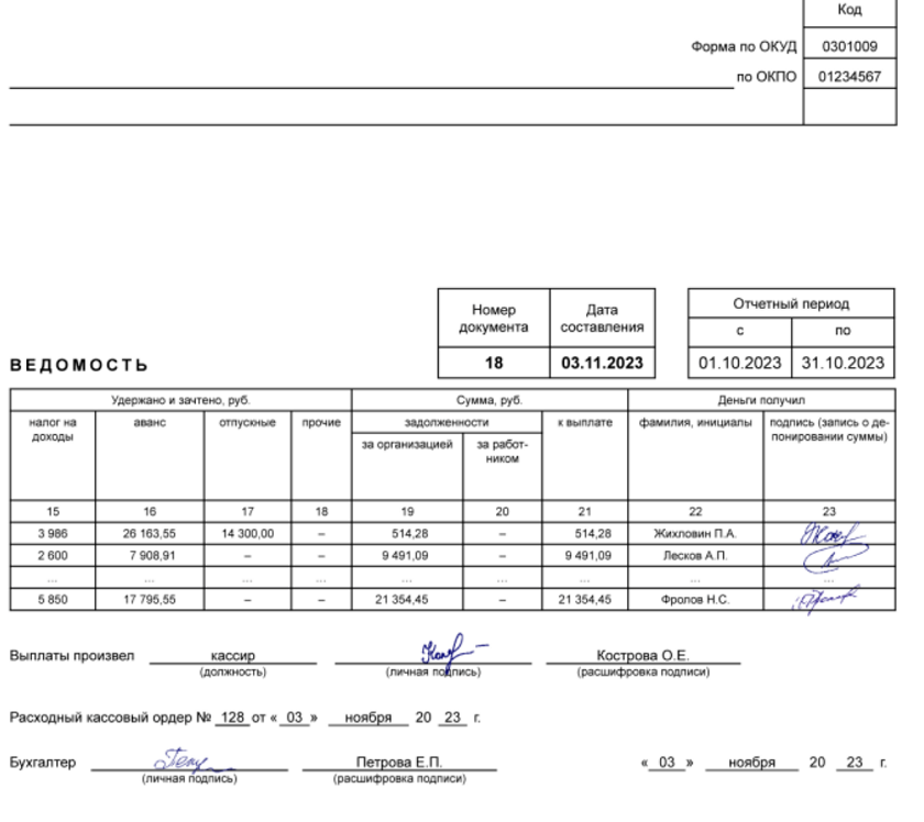 Перед тем как начать совершать выдачу денег по ведомости, сотруднику, отвечающему за её заполнение, необходимо перепроверить все сведения на наличие ошибок.