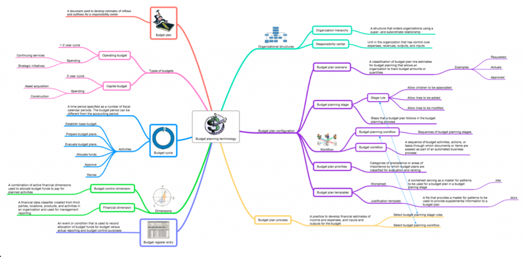 - Процессы планирования бюджета — Процессы планирования бюджета определяют, как бюджетные планы можно обновить, направить, просмотреть и утвердить в иерархии бюджетной организации. Процесс планирования бюджета связан с бюджетным циклом и организацией через юридическое лицо.