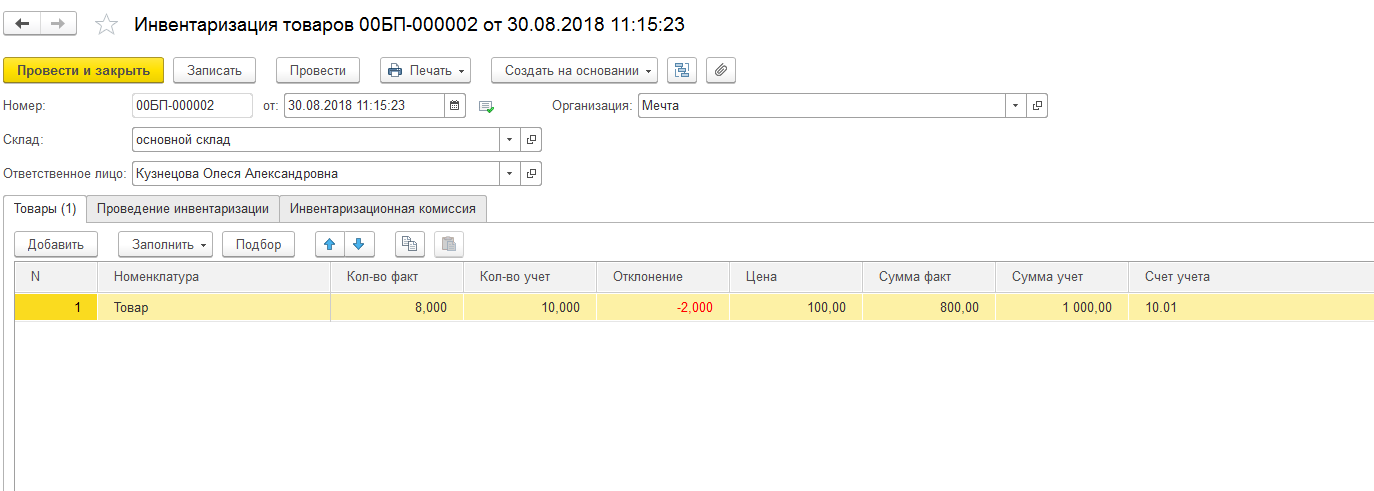 - Составляется комиссия, присутствуют завскладом и назначенные МОЛ, осуществляется пересчитывание товаров и материалов с занесением показателей в графу «Фактическое наличие».