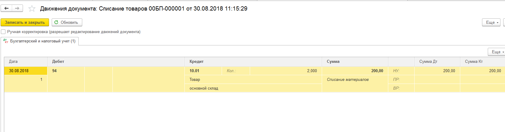 После проведения проверяем сформированные движения. Образуется проводка по дебету счёта 94 и кредиту счета учёта товара или материала. Проверяем, чтобы бухгалтерская запись сформировалась по количеству и сумме (рис. 3). Из «Списания товара» можно вывести на печать Акт о списании форма ТОРГ-16.