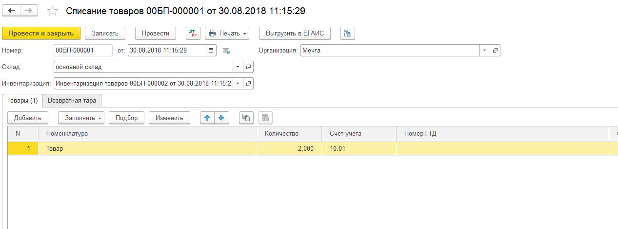 Вот и подошёл момент списания товара. На основании «Инвентаризации» создаем «Списание товара» (рис. 2.), табличная часть заполняется автоматически.