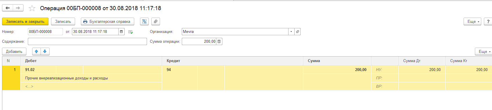 После определения причины списания товара зарегистрированная недостача списывается на счета затрат, за счёт виновного лица, либо на счёт прочих расходов организации, о чём писали выше. В программе оформляем с помощью «Операции, введённой вручную» (рис. 4) в разделе «Операции». Для проверки правильности отражения процесса по списанию товаров формируем оборотно-сальдовую ведомость. Сверяем остатки по счёту учёта товаров, счёт 94 закрывается.