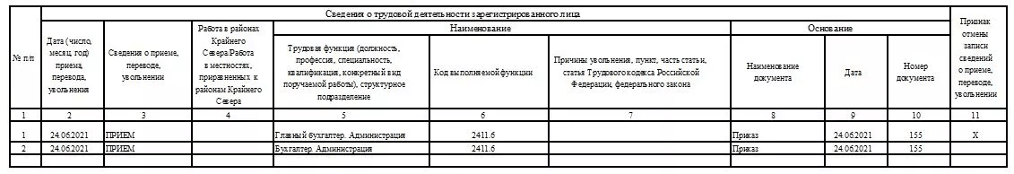 Заполнение сведений о трудовой деятельности (10 граф таблицы):