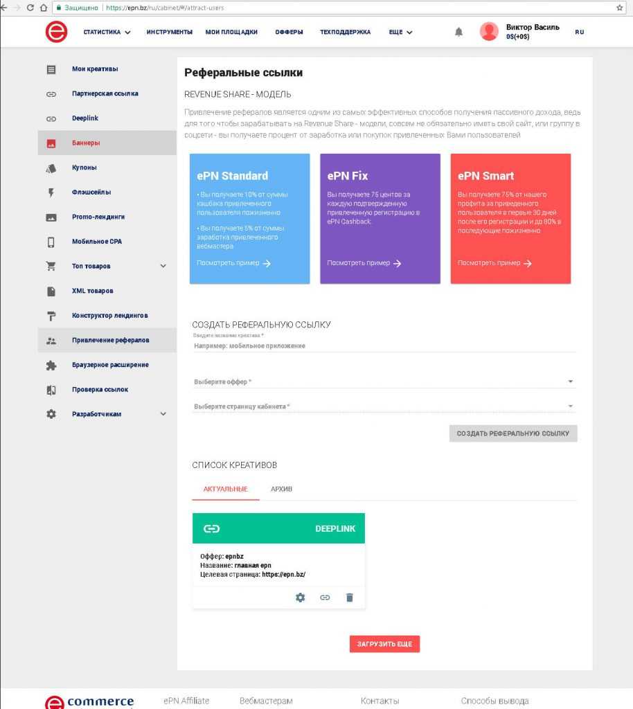 На скриншоте видно, что моя реферальная ссылка ведёт на главную страницу — EPN.biz. Вы же можете выбрать другую «Целевую страницу».