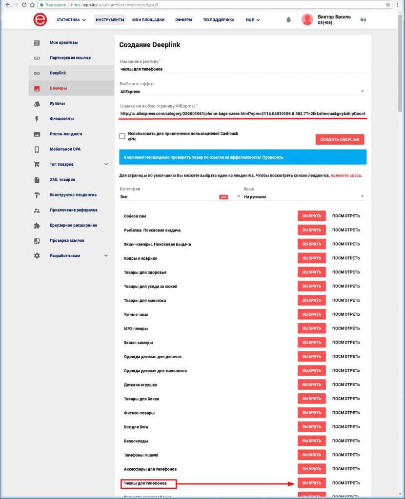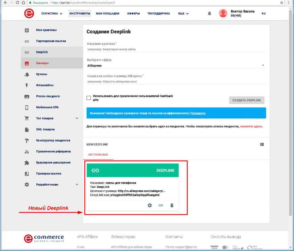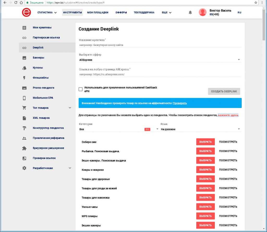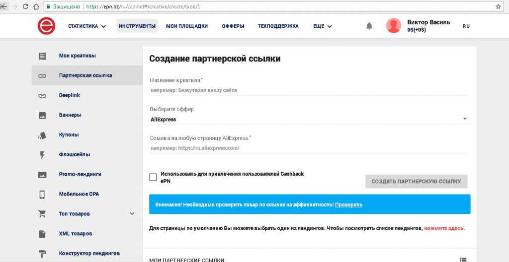 «Партнёрские ссылки» — название говорит само за себя, в этом разделе можно создать ссылку в вашим персональным идентификатором на один конкретный товар.